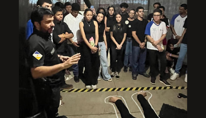 A atividade integrou teoria e prática. Os alunos iniciaram a apresentação explicando o funcionamento dos órgãos de perícia criminal e o papel de cada instituto nas investigações. Em seguida, os profissionais convidados assumiram a parte prática, conduzindo a simulação de uma perícia em local de crime.